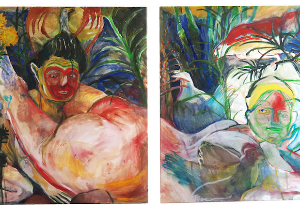 In her paintings, Jeanne Jacob presents a colourful world, where intimacy, fantasy and personal success take the stage and express themselves, interwoven with contradictions, repressed desires or absurd ideas. The characters in the paintings try to be romantic. They are searching for some new lovers who appreciate real, deep hugs and with whom they can share a healthy and humorous look to their vulnerabilities.